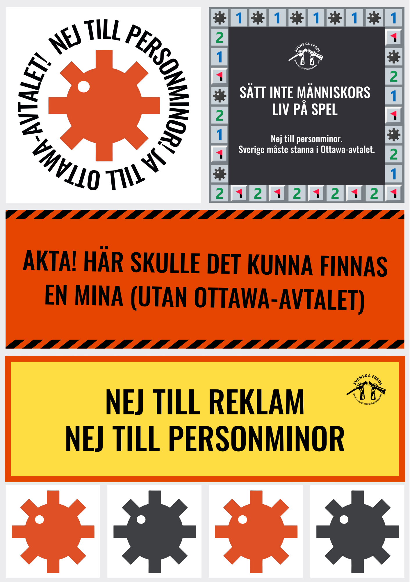 Säg nej till minor med vårt aktivistkit! Du får ett A5-ark (14,8x21 cm) med åtta klistermärken. Fäst dem på datorn, mobilen, vattenflaskan och ytterdörrenoch hjälp oss att sprida ordet om personminor och Ottawa-avtalet. Samtidigt stöttar du Svenska Freds fredsbyggande arbete så att vi kan fortsätta granska och sätta press på våra politiker och makthavare.