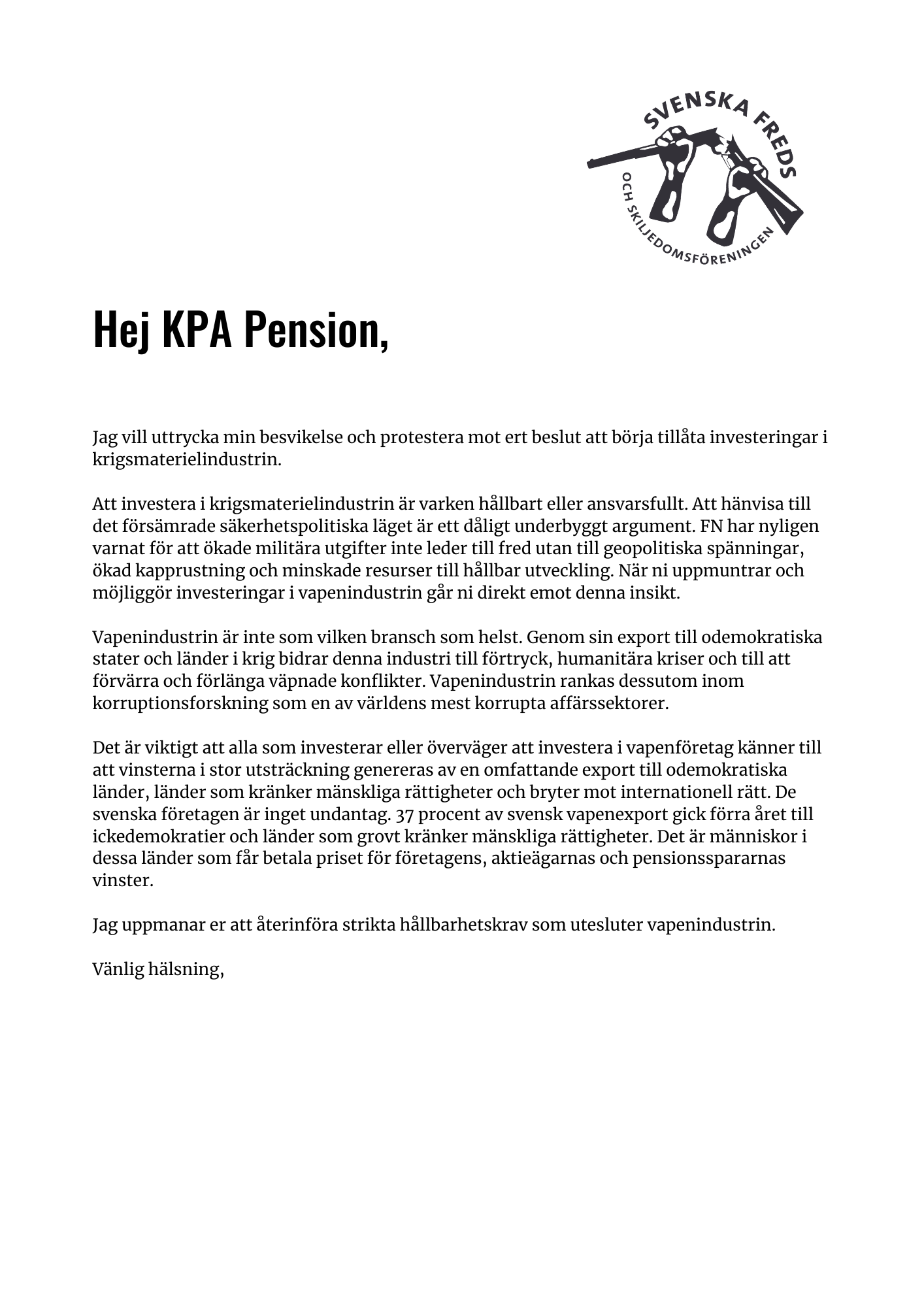 KPA Pension kommer från 1 januari 2026 tillåta investeringar i krigsmaterielindustrin, en sektor som de tidigare uteslutit. KPA marknadsför sig med att investera långsiktigt, placera med omtanke och att de 340 miljarder i pensionspengar de förvaltar åt mer än 2 miljoner offentliganställda “kan göra skillnad på riktigt”. Att investera i företag som gör vinst på vapen, krigoch militär upprustning är aldrig hållbart. Tvärtom varnar FN för att de ökade militära utgifterna sker på bekostnad av fred och hållbar utveckling.